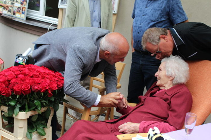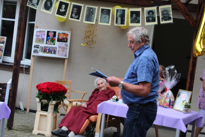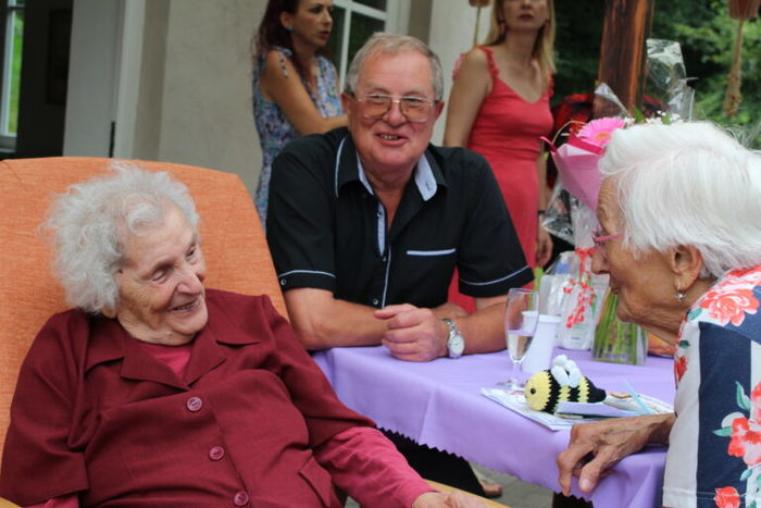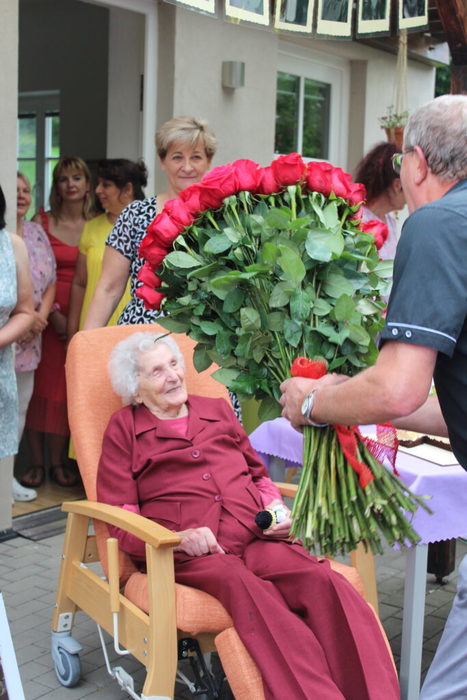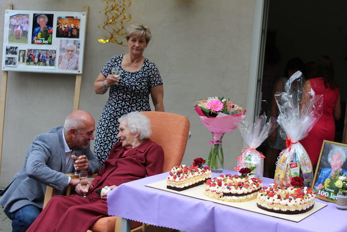 Jsme rádi, že určitou etapu svého života prožila v našem Domově a že jsme dnes spolu s ní a s její rodinou mohli oslavit její velký den. Ke gratulantům se kromě rodiny přidal i pan starosta Martin Holub, pan tajemník Ing. Jiří Hodic, rodina a za Domov pro seniory paní Bc. Vlasta Szotkowská. A protože paní Zdenička miluje hudbu, přišla jí zahrát také bílovecká dechovka Rozmarýnka. Nechyběl ani dort ve tvaru 100 a 100 rudých růží.