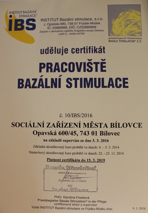 Dne 3. března 2016 proběhla v Domově pro seniory v Bílovci supervize Bazální stimulace, jejímž supervizorem byla PhDr. Karolína Friedlová. Cílem bylo získat certifikát „Pracoviště Bazální stimulace.“